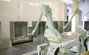 粉体塗装は有機溶剤(シンナー等)を含まない環境に優しい塗装であるとともに、サビにくい・傷がつきにくいなど塗膜性能の優れた高品質塗装でもあります。塗着しなかった使用済み塗料は自動回収システムによりリユース(再利用)されますが、リユースし切れない廃塗料はマテリアルリサイクルされます。塗装ロボットなどの採用で製造工程の無人化、効率化も進み、ムリ・ムラ・ムダを極力排除しました。